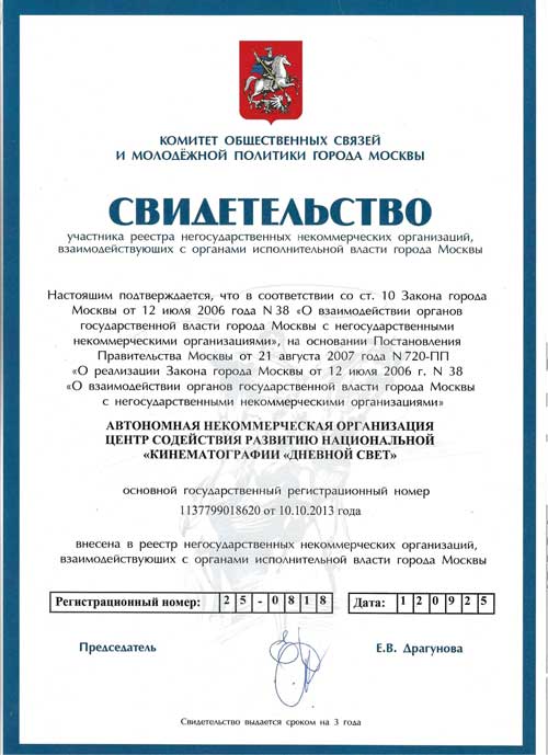Наша организация АНО «Центр содействия развитию национальной кинематографии «ДНЕВНОЙ СВЕТ» внесена в реестр негосударственных некоммерческих организаций, взаимодействующих с органами исполнительной власти города Москвы