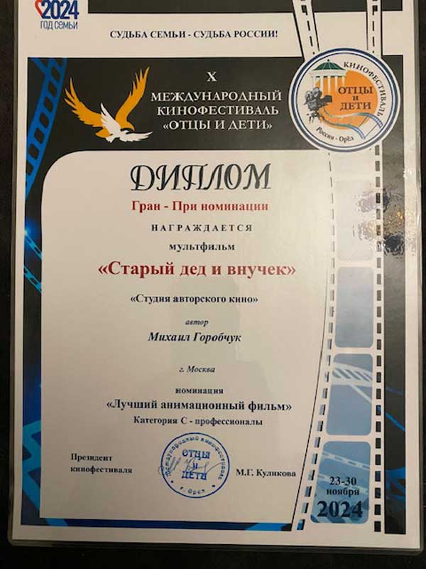 - Диплом Гран-При номинации – в номинации «Лучший анимационный фильм» награждается мультфильм «Старый дед и внучек» автор Михаил Горобчук