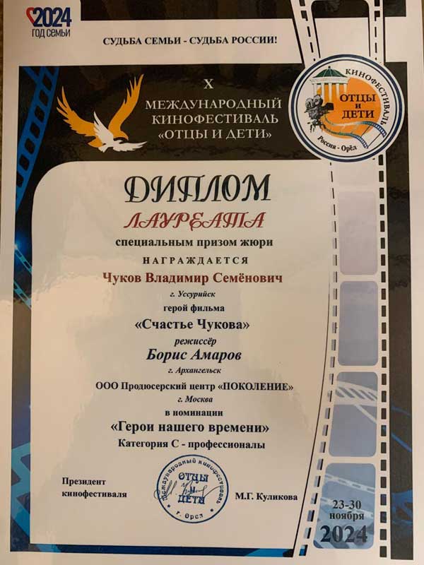 - Диплом лауреата – специальным призом жюри в номинации «Герои нашего времени» награждается герой фильма Чуков Владимир Семенович