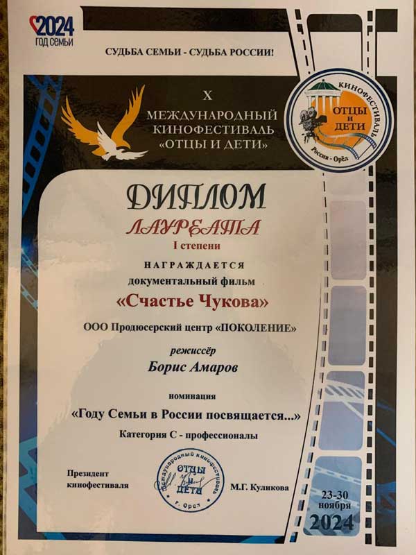 - Диплом лауреата I степени – в номинации «Году Семьи в России посвящается…» награждается режиссер фильма Борис Амаров за фильм «Счастье Чукова»