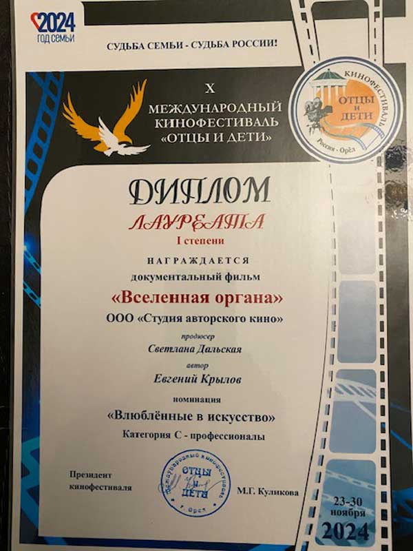 - Диплом лауреата I степени – в номинации «Влюбленные в искусство» награждается продюсер Светлана Дальская и автор Евгений Крылов